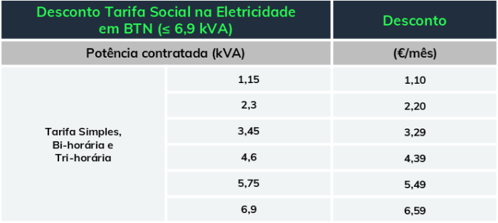A Tarifa Social na eletricidade corresponde a um desconto na tarifa de acesso às redes e incide sobre a potência contratada e sobre o preço de consumo de energia: