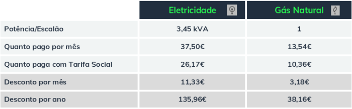 Neste exemplo, o cliente com tarifa social poupa cerca de 171 €/ano em eletricidade e gás natural, antes de taxas e impostos.