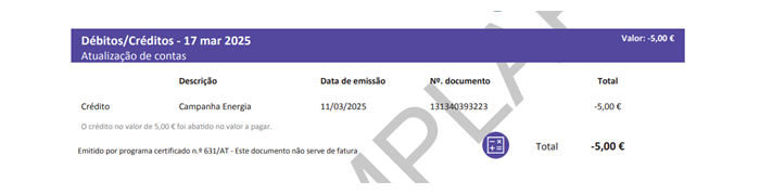 Nota: a descrição terá um texto adaptado ao produto EV Smartcharging ainda a definir, com limite de 40 caracteres. A data de emissão corresponde à data de entrada do crédito na conta corrente do cliente, que irá ser anterior à data da faturação.