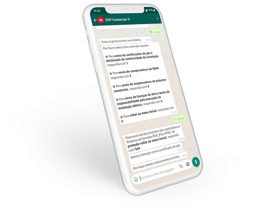 Quais são as funcionalidades disponiveis no WhatsApp da EDP Comercial?